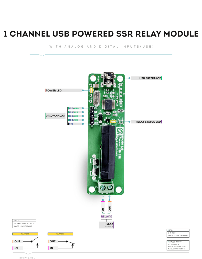 Numato Lab’s 1 Channel USB Solid State Relay Module is great for controlling your devices through USB without any USB protocol knowledge. This module plugs into your design seamlessly. Individual relay can be controlled by simple commands.